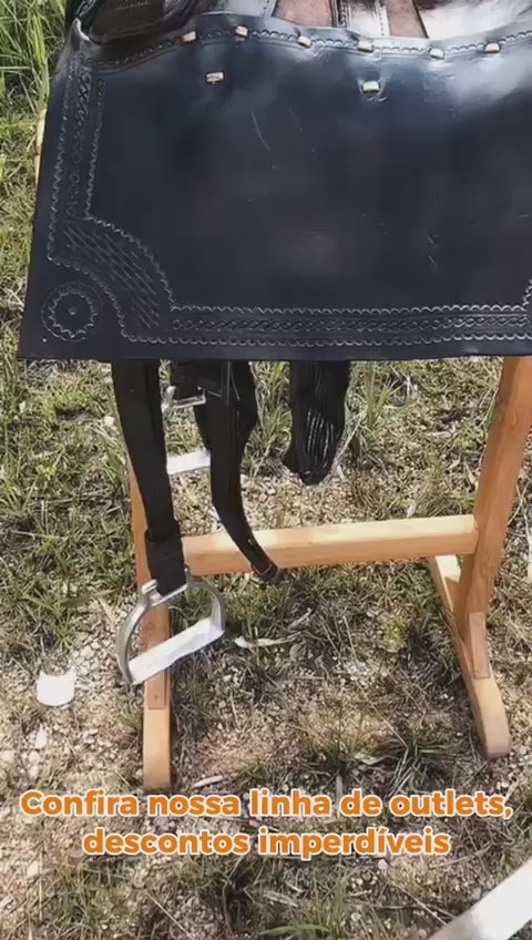 O Arreio Tradicional de Cabeça em Couro com Assento Seco é ideal para quem valoriza funcionalidade e resistência na lida do dia a dia. Produzido em couro legítimo e costuras reforçadas, é um modelo robusto, projetado para enfrentar o uso constante em cavalgadas ou trabalho no campo. Seu assento seco, tradicional e firme, oferece melhor firmeza ao cavaleiro, sendo uma opção preferida por quem busca controle e desempenho. A armação é feita em madeira recoberta com couro cru, aumentando a durabilidade e a estabilidade. Este modelo acompanha cabeçada, rédea, loros, látegos, contra-látegos e estribos em couro, oferecendo um conjunto completo e pronto para uso. Por ser um produto outlet, você aproveita um excelente custo-benefício, com envio imediato e garantia de procedência. Disponível em tamanhos variados para melhor adaptação ao seu animal.